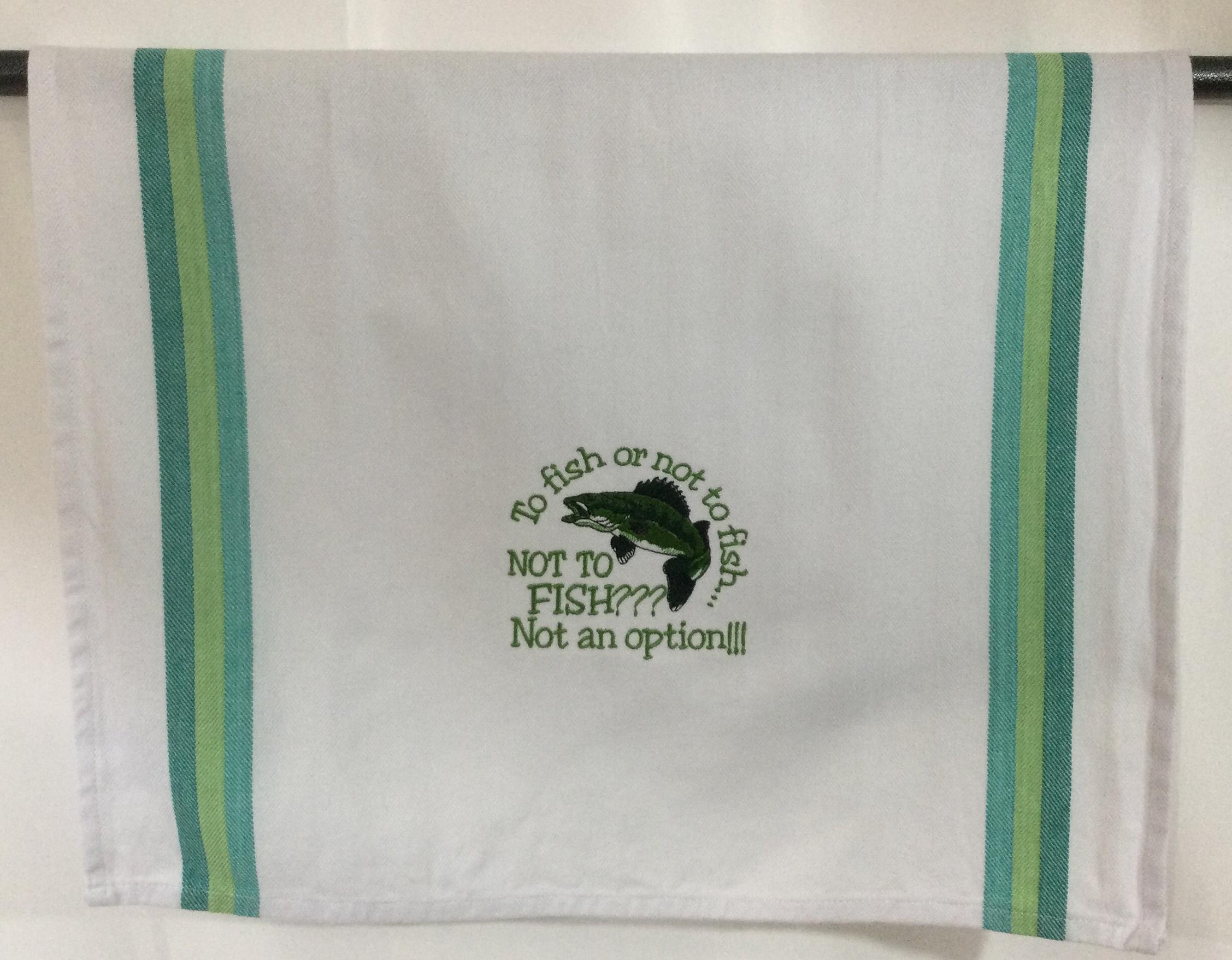 Cotton kitchen towel embroidered with a funny saying, To Fish or Not To Fish - Family and Friends will enjoy this towel. Make your fishing friend smile when they open your gift.